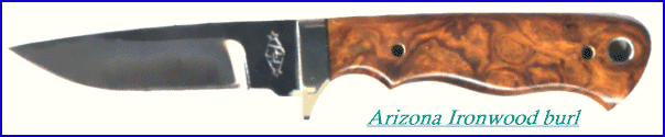 Blade #2029 - 440-C 3.75" drop point - Full tang, Arizona Ironwood Burl slab handle, NS guard, brass tube rivets, SS thong hole,red & white vulcanized spacers. Leather sheath.