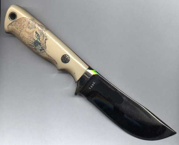 Blade # 1999-27Gut hook skinner - 5" 440-C blade, NS guard & butt plate, fossil deer antler, cocobolo, vulcanized fiber, rubber and aluminum spacers, leather sheath. |